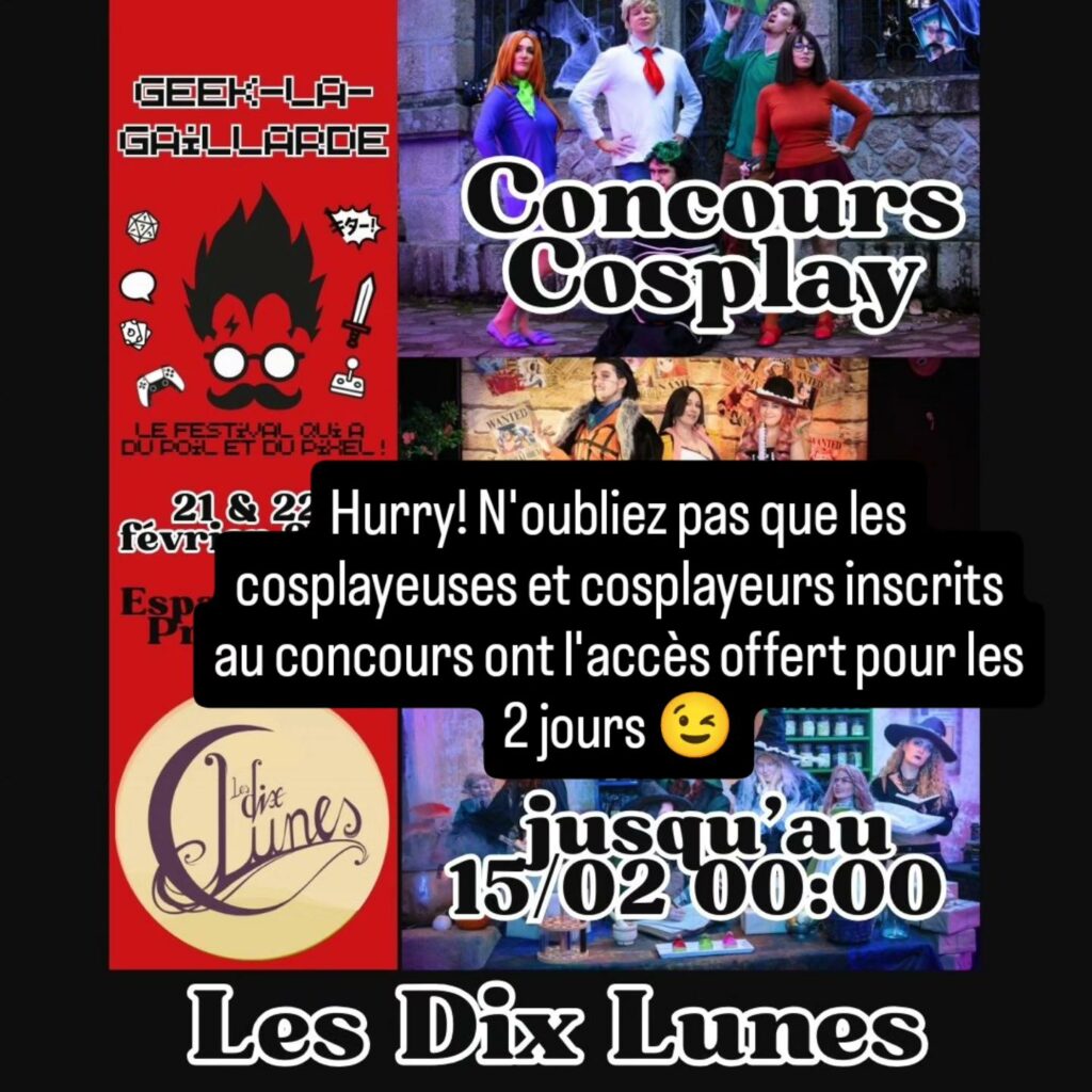 Dimanche 22 février, c'est le jour du concours de cosplay! Organisé par l'association @lesdixlunes, 3 prix seront remis : Prix du Costume, Prix de la Prestation et Prix du Public (avec cash prizes et trophées).